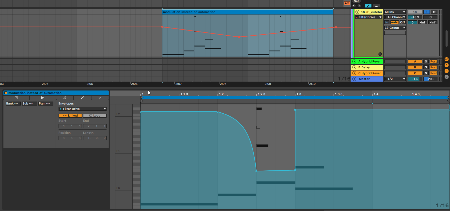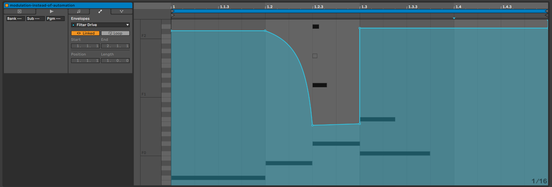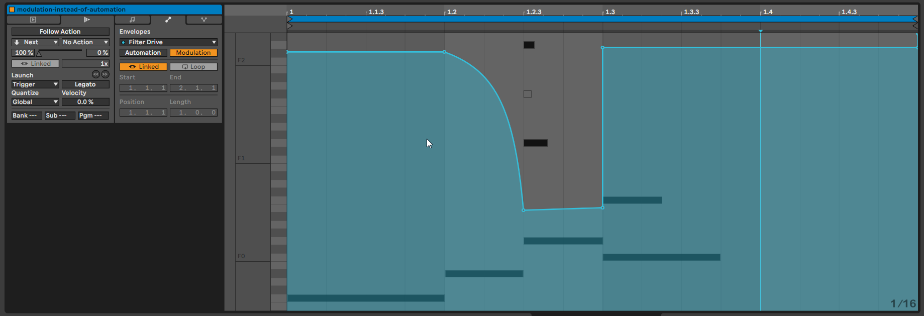 Now you can automate the absolute value (that this modulation-over-time applies to) in the Arrangement view, if you’d like to. The following (and last) screenshot demonstrates this: